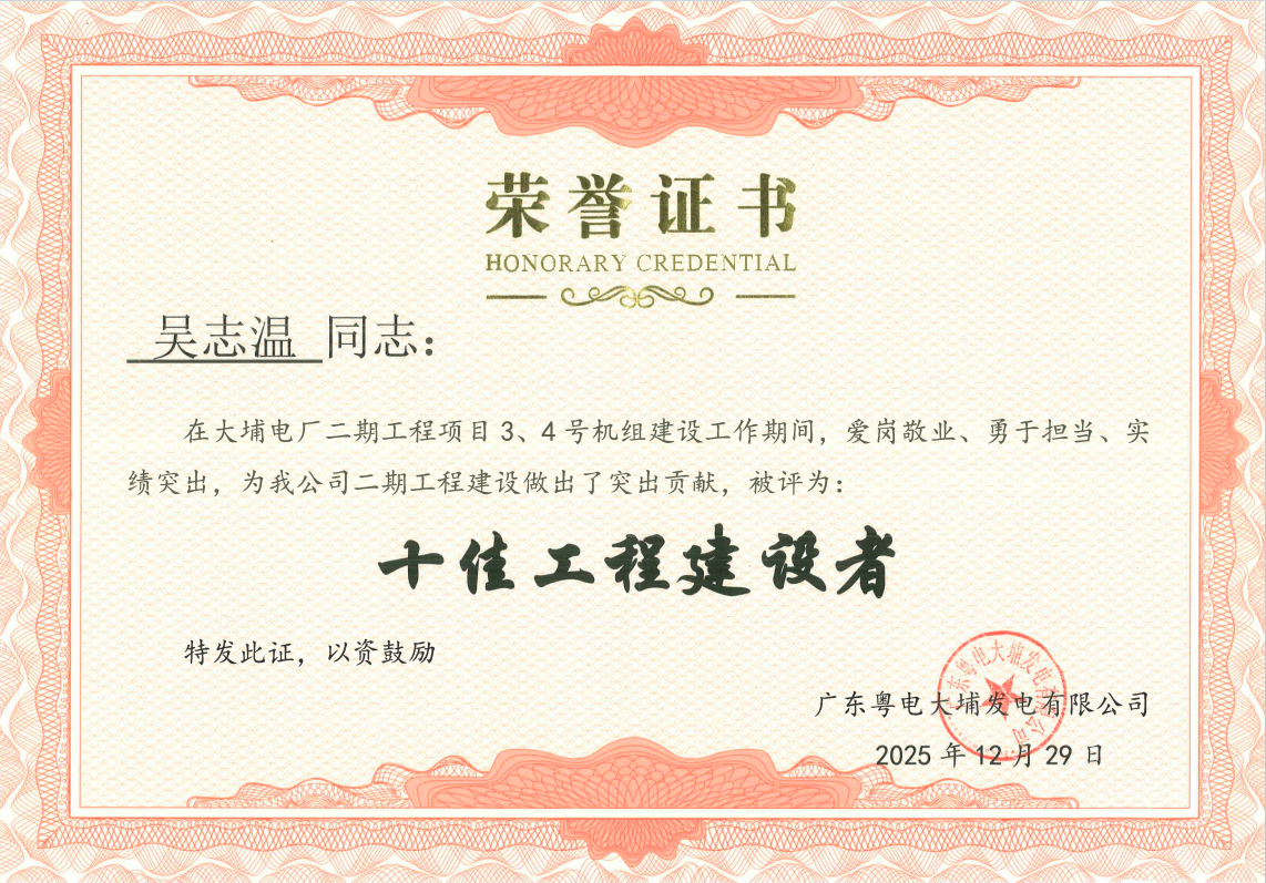 2025年12月29日,广东粤电大埔发电有限公司“十佳工程建设者”评选结果揭晓,国诚集团有限公司承建的广东粤电大埔电厂二期工程6号地块边坡治理施工项目部项目经理吴志温成功入选。这份荣誉不仅是对个人工作的高度肯定,更是业主单位对我司工程建设水平、项目管理能力与优质服务品质的充分认可。